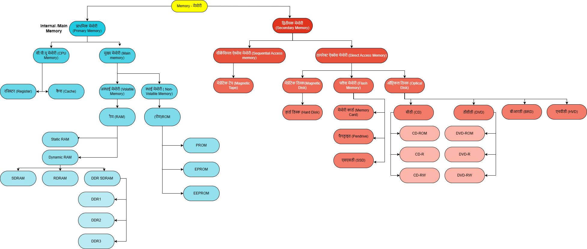 | नाम | मुख्य मेमोरी (Main Memory) | सहायक मेमोरी (Auxiliary Memory) |